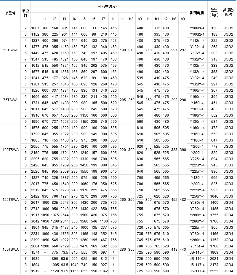 TSWA型多級離心泵可供輸送80℃以下的清水或物理、化學(xué)性質(zhì)類似于水的其他液體,廣泛適用于城市建筑、工廠、礦山的給排水,尤其適用于賓館、飯店娛樂場所的制冷、空調(diào)給水。